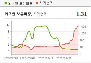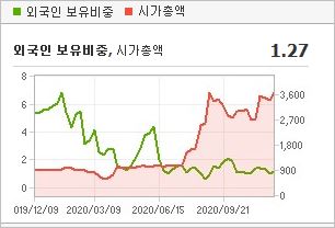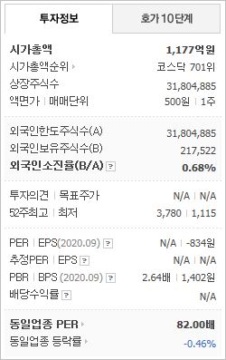 시가총액 1,177억원으로 코스닥 701위를 기록하고 있으며, 외국인소진율은 0.68%입니다. 2020년 9월 기준, PBR 2.64배, BPS 1,402원이며, 배당수익률은 없습니다.