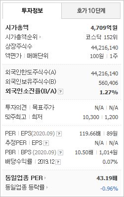 시가총액 4,709억원으로 코스닥 152위를 기록하고 있으며, 외국인소진율은 1.27%입니다. 2020년 9월 기준, PER 119.66배, PBR 10.5배이며, 배당수익률은 0.07%입니다.