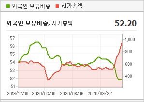 시가총액 991억원으로 코스닥 806위를 기록하고 있으며, 외국인소진율은 51.69%입니다. 2020년 9월 기준, PER 38.68배, PBR 0.97배이며, 배당수익률(2019.12)은 0.73%입니다.
