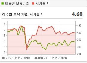 시가총액 326억원으로 코스닥 1330위를 기록하고 있으며, 외국인소진율은 0.45%입니다. 2020년 9월 기준, PBR 1.8배, BPS 1,236원이며, 배당수익률은 없습니다.