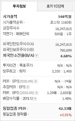 시가총액 548억원으로 코스닥 1160위를 기록하고 있으며, 외국인소진율은 4.68%입니다. 2020년 9월 기준, PBR 1.29배, BPS 2,605원이며, 배당수익률(2019.12)은 1.48%입니다.