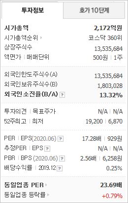 시가총액은 2,172억원으로 코스닥 360위이며, 외국인소진율은 13.32% 입니다. 2019년 기준, ROE 15.73%, PER 10.48배, PBR 1.47배이며, 배당률은 0.48% 입니다.